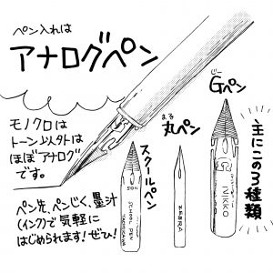 高﨑真晴 :人物はGペンとスクールペン、髪の毛は丸ペン、背景はスクールペンとドローイングペン0.05を使っています。インクは開明墨汁で、伸びの良さ・濃さ・仕上がりの美しさがとにかく素晴らしく、長く愛用しています。